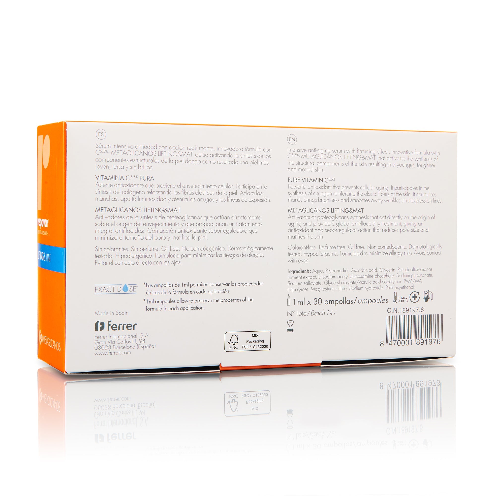 Repavar Revitalizante Metaglicanos Lifting&Mat 30 Ampollas. Tratamiento intensivo antiedad específico para la pielmixta/grasa. Tratamiento diario único que actua desde el interior de la dermis, activando la sintesis de los componentes fundamentales de la piel, para un mayor sustento y firmeza en la piel. Con 5,5% de Vitamina C pura, y metaglicanos antiedad, previene la formación de radicales libres debidos a la radiación solar y la polución y ayuda a reducir arrugas y perdida de firmeza. Gracias a su formulación especifica para pielmixta/grasa, ayuda a reducir el numero y el tamaño de los poros, disminuyendo los brillos de la piel.