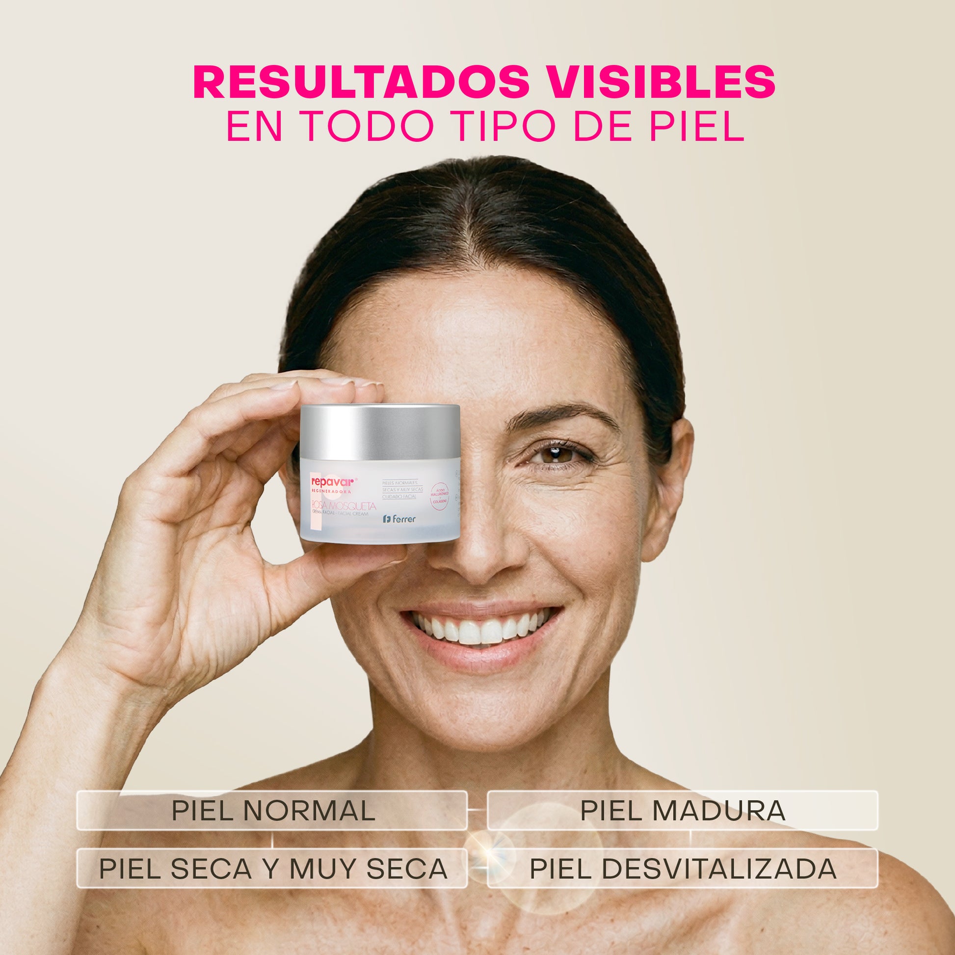 Crema Facial antiedad con aceite de rosa mosqueta, ácido hialurónico, colágeno, vitamina E y manteca de Karité que hidrata intensamente facilitando la recuperación de las pieles maduras, secas o desvitalizadas, combate las arrugas y los signos del envejecimiento y aporta firmeza, elasticidad y confort al rostro.