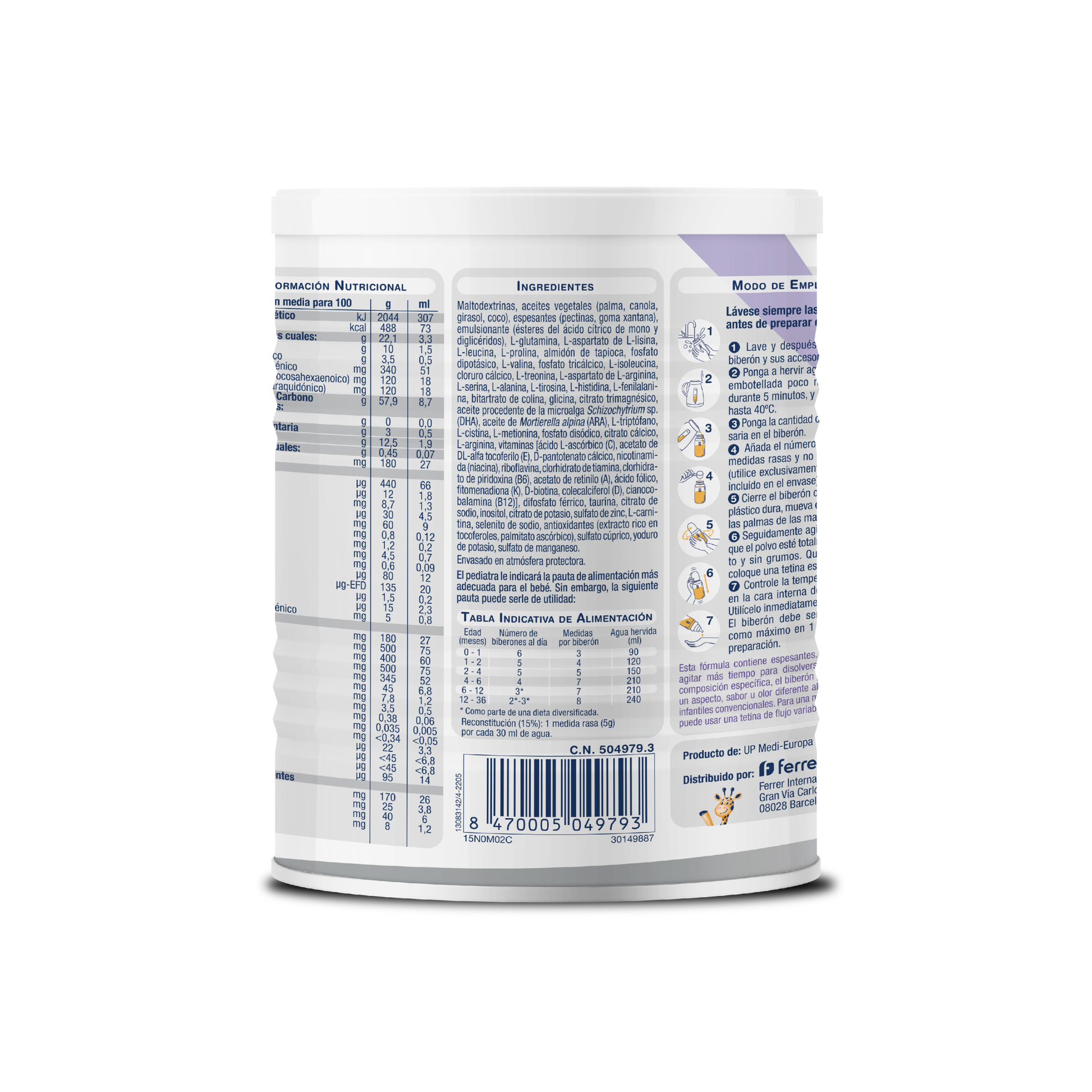 Maltodextrinas, aceites vegetales (palma, canola, girasol, coco), espesantes (pectinas, goma xantana), emulsionante (ésteres del ácido cítrico de mono y diglicéridos), L-glutamina, L-aspartato de L-lisina, L-leucina, L-prolina, almidón de tapioca, fosfato dipotásico, L-valina, fosfato tricálcico, L-isoleucina, cloruro cálcico, L-treonina, L-aspartato de L-arginina, L-serina, L-alanina, L-tirosina, L-histidina, L-fenilalanina, bitartrato de colina, glicina, citrato trimagnésico, aceite procedente de la microalga Schizochytrium sp. (DHA), aceite de Mortierella alpina (ARA), L-triptófano, L-cistina, L-metionina, fosfato disódico, citrato cálcico, L-arginina, vitaminas [ácido L-ascórbico (C), acetato de DL-alfa tocoferilo (E), D-pantotenato cálcico, nicotinamida (niacina), riboflavina, clorhidrato de tiamina, clorhidrato de piridoxina (B6), acetato de retinilo (A), ácido fólico, fitomenadiona (K), D-biotina, colecalciferol (D), cianocobalamina (B12)], difosfato férrico, taurina, citrato de sodio, inositol, citrato de potasio, sulfato de zinc, L-carnitina, selenito de sodio, antioxidantes (extracto rico en tocoferoles, palmitato ascórbico), sulfato cúprico, yoduro de potasio, sulfato de manganeso.