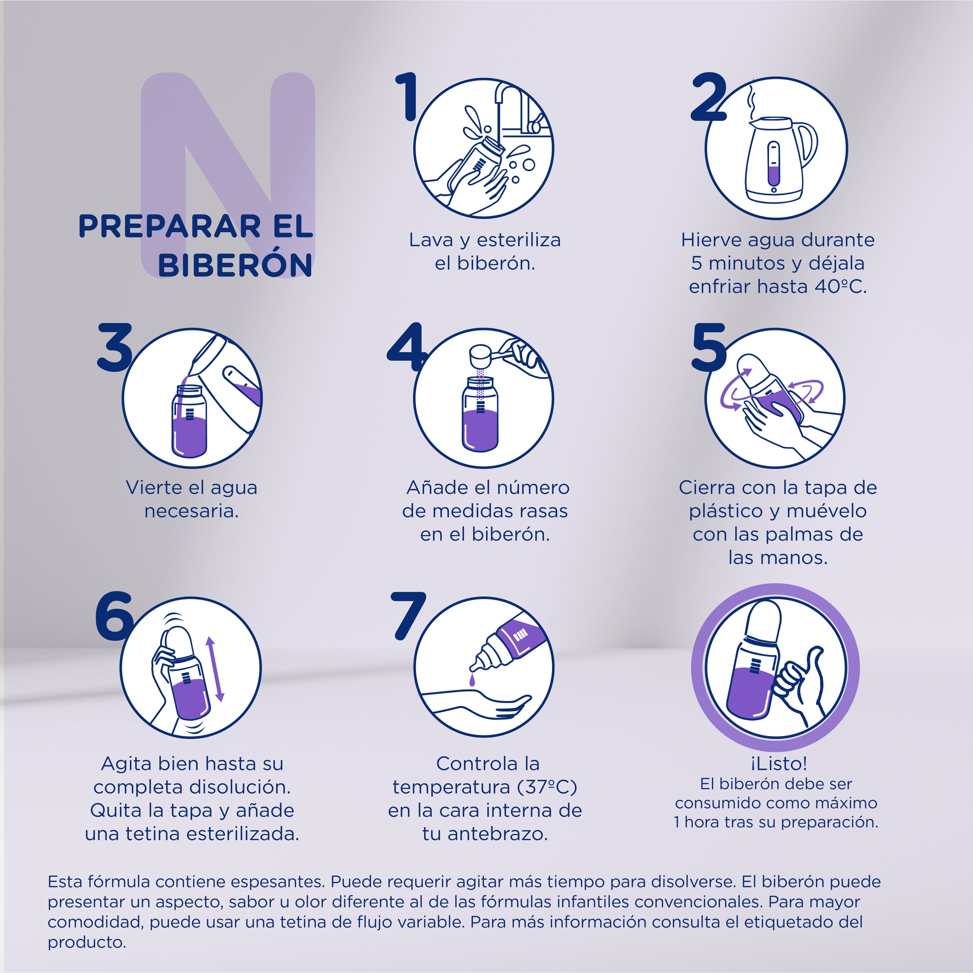 1. Lava y esteriliza el biberón. 2. Hierve agua durante 5 minutos y déjala enfriar hasta 40°C. 3. Vierte el agua necesaria. 4. Añade el número de medidas rasas en el biberón. 5. Cierra con la tapa de plástico y muévelo con las palmas de las manos. 6. Agita bien hasta su completa disolución. Quita la tapa y añade una tetina esterilizada. 7. Controla la temperatura (37°C) en la cara interna de tu antebrazo. 8. El biberón debe ser consumido como máximo 1 hora tras su preparación.