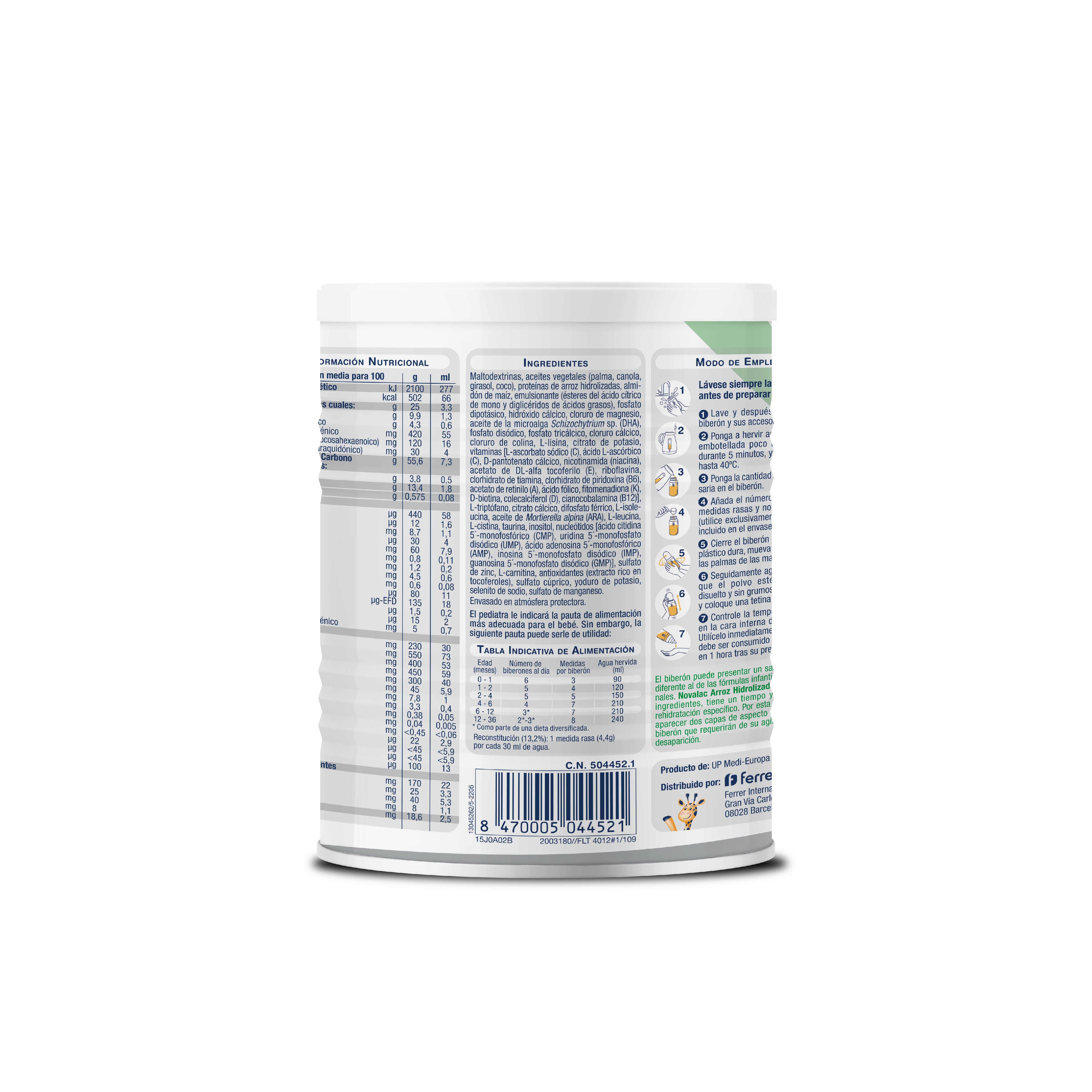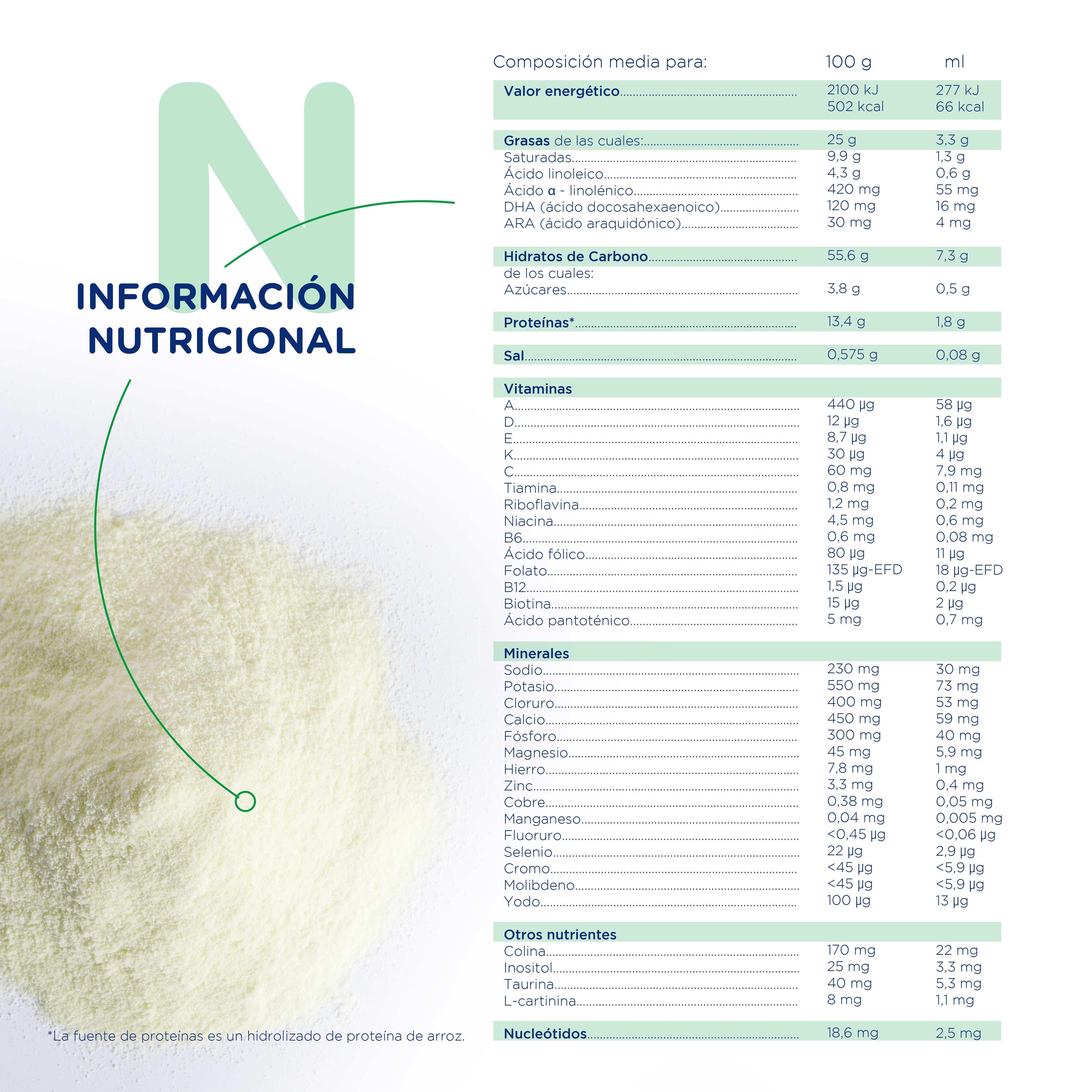 Maltodextrinas, aceites vegetales (palma, canola, girasol, coco), proteínas de arroz hidrolizadas, almidón de maíz, emulsionante (ésteres del ácido cítrico de mono y diglicéridos de ácidos grasos), fosfato dipotásico, hidróxido cálcico, cloruro de magnesio, aceite de la microalga Schizochytrium sp. (DHA), fosfato disódico, fosfato tricálcico, cloruro cálcico, cloruro de colina, L-lisina, citrato de potasio, vitaminas [L-ascorbato sódico (C), ácido L-ascórbico (C), D-pantotenato cálcico, nicotinamida (niacina), acetato de DL-alfa tocoferilo (E), riboflavina, clorhidrato de tiamina, clorhidrato de piridoxina (B6), acetato de retinilo (A), ácido fólico, fitomenadiona (K), D-biotina, colecalciferol (D), cianocobalamina (B12)], L-triptófano, citrato cálcico, difosfato férrico, L-isoleucina, aceite de Mortierella alpina (ARA), L-leucina, L-cistina, taurina, inositol, nucleótidos [ácido citidina 5´-monofosfórico (CMP), uridina 5´-monofosfato disódico (UMP), ácido adenosina 5´-monofosfórico (AMP), inosina 5´-monofosfato disódico (IMP), guanosina 5´-monofosfato disódico (GMP)], sulfato de zinc, L-carnitina, antioxidantes (extracto rico en tocoferoles), sulfato cúprico, yoduro de potasio, selenito de sodio, sulfato de manganeso.