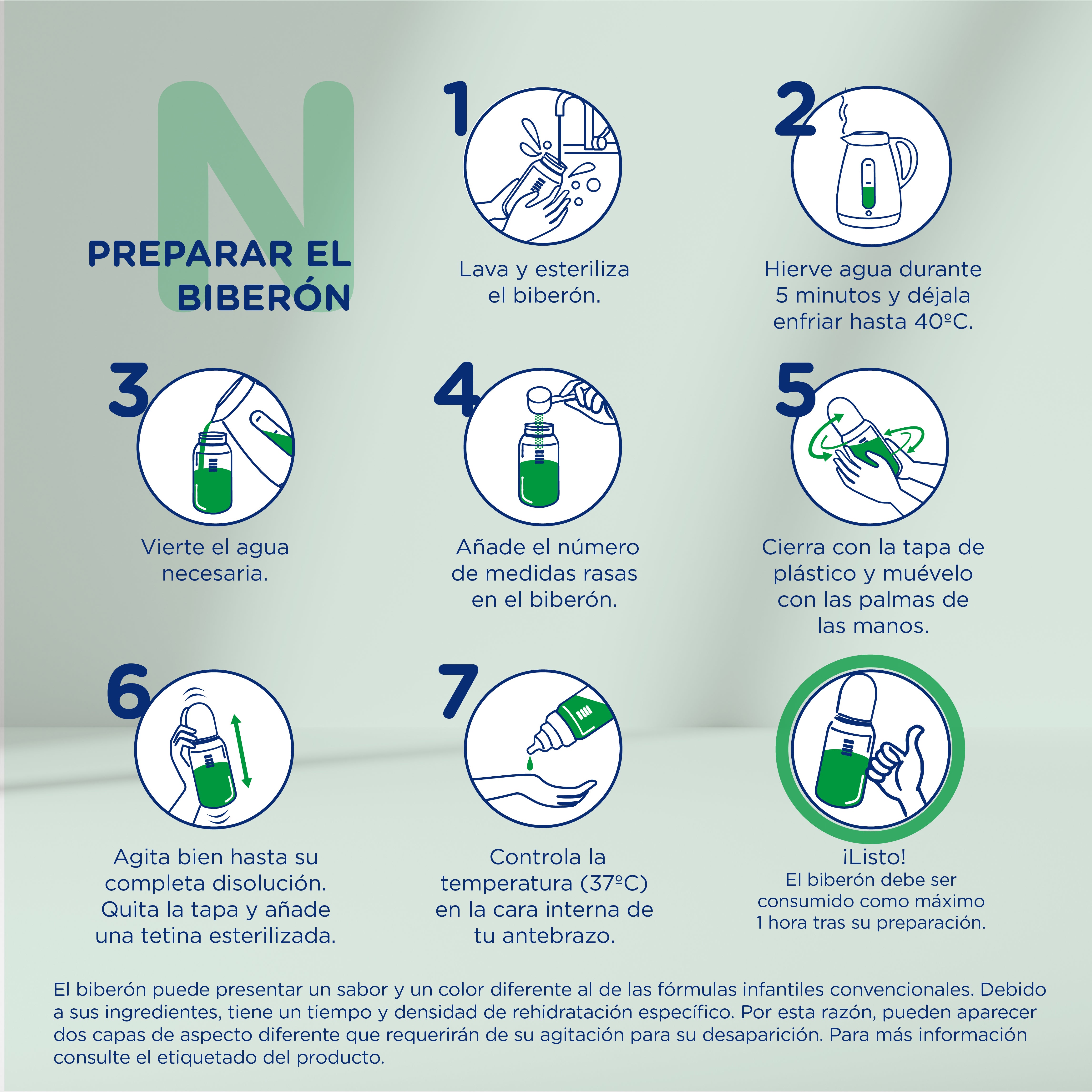 1. Lava y esteriliza el biberón. 2. Hierve agua durante 5 minutos y déjala enfriar hasta 40°C. 3. Vierte el agua necesaria. 4. Añade el número de medidas rasas en el biberón. 5. Cierra con la tapa de plástico y muévelo con las palmas de las manos. 6. Agita bien hasta su completa disolución. Quita la tapa y añade una tetina esterilizada. 7. Controla la temperatura (37 °C) en la cara interna de tu antebrazo. 8. El biberón debe ser consumido como máximo 1 hora tras su preparación.