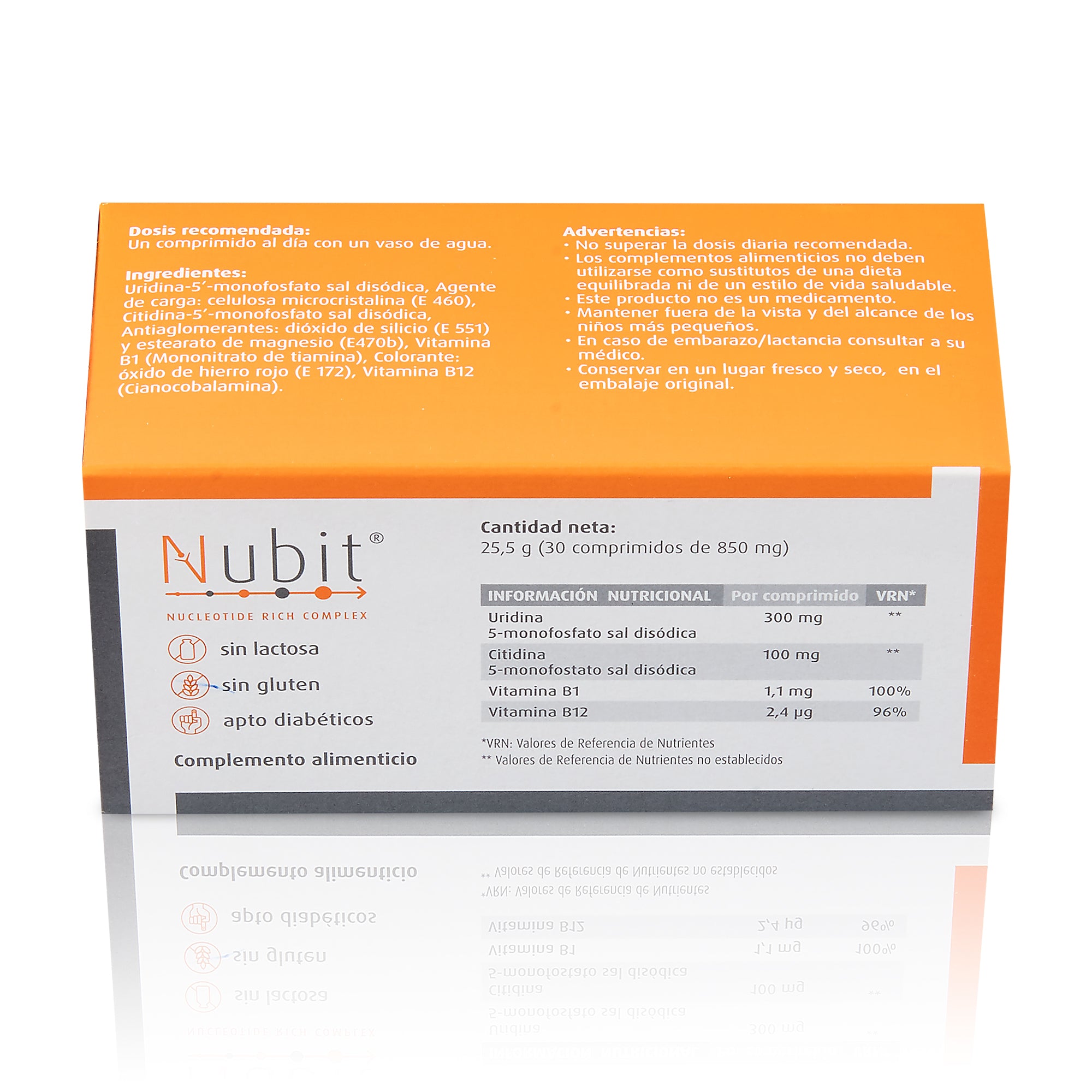 Nubit es un complemento alimenticio a base de vitaminas B1 y B12 que contribuyen al normal funcionamiento del sistema nervioso formulado con altas dosis de nucleótidos recomendables en ciertas situaciones con mayores exigencias.