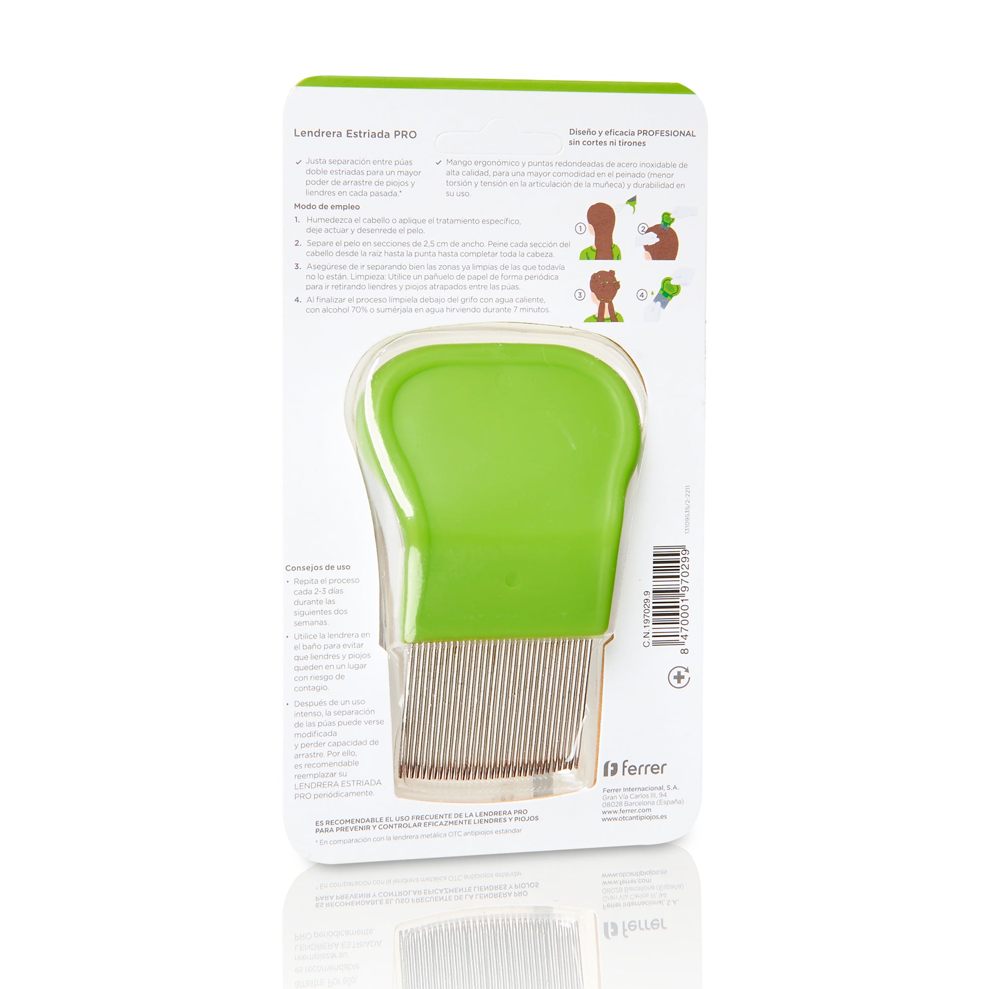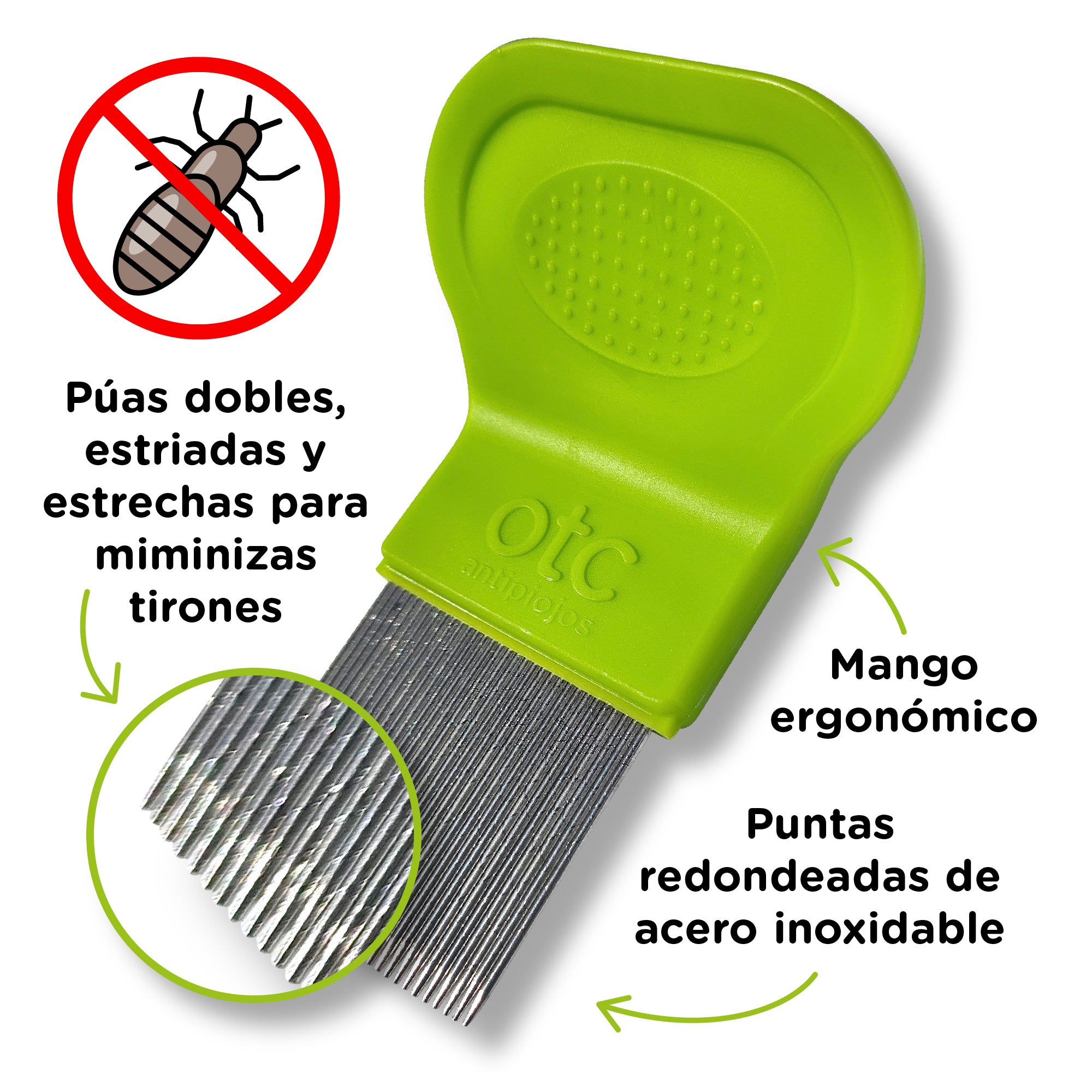 Lendrera Estriada de OTC Antipiojos es un peine profesional de púas doble estriadas y estrechas que permite desprenderse de los piojos y liendres más difíciles. Diseño y eficacia profesional sin cortes ni tirones. Es recomendable el uso frecuente de la Lendrera Estriada Pro para prevenir y controlar eficazmente liendres y piojos. Peine profesional de púas doble estriadas y estrechas. Desprende liendres y piojos. Las púas doble estriadas cuentan con la separación necesaria para un mayor poder de arrastre de piojos y liendres en cada pasada (en comparación a la lendrera estándar). Mango ergonómico y puntas redondeadas de acero inoxidable de alta calidad, para una mayor comodidad en el peinado (menor torsión y tensión en la articulación de la muñeca) y durabilidad en su uso.