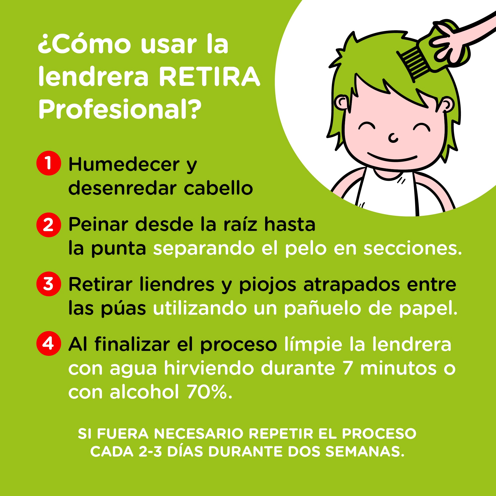 Asegúrese de ir separando bien las zonas ya limpias de las que todavía no lo están. Limpieza: Utilice un pañuelo de papel de forma periódica para ir retirando liendres y piojos atrapados entre las púas.