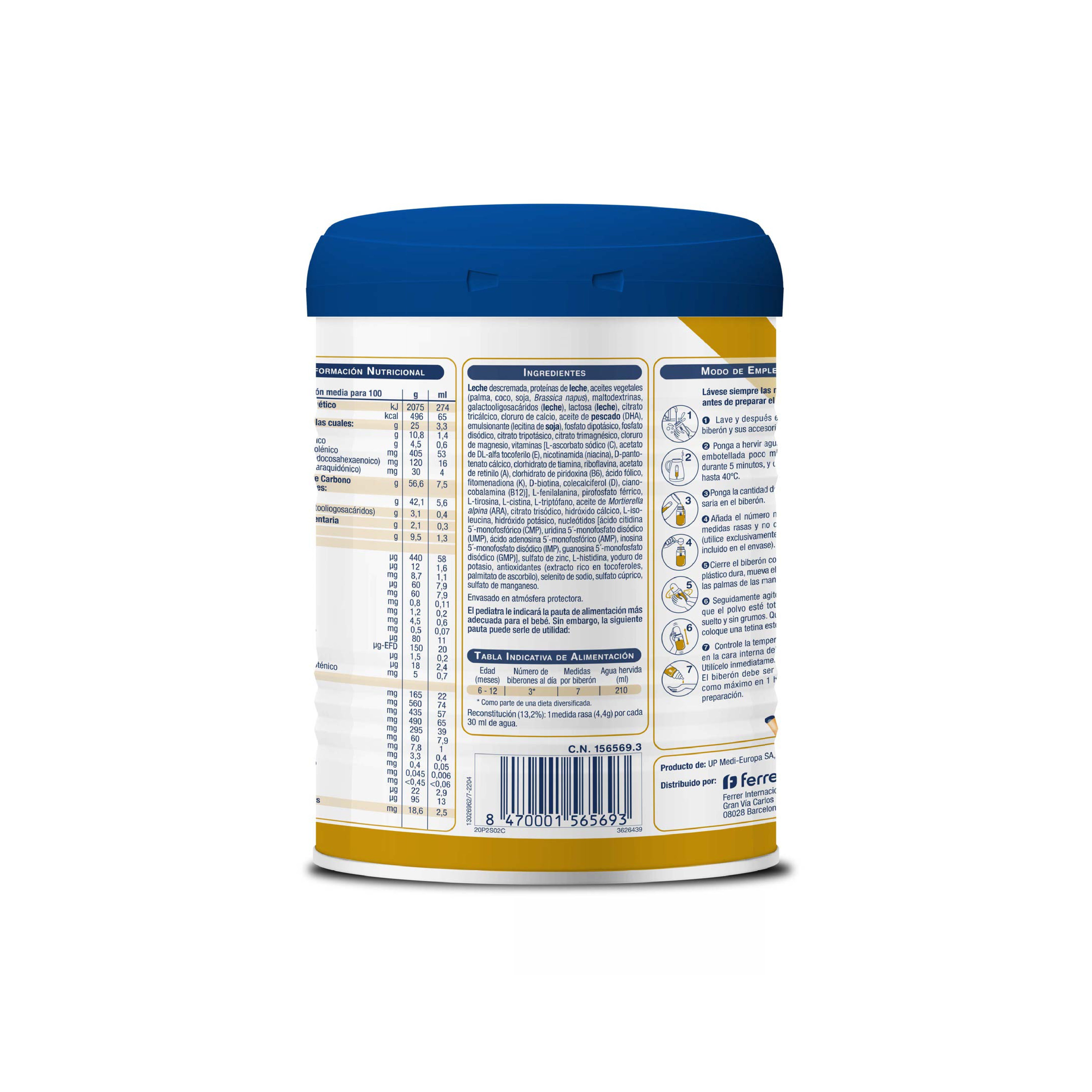 Leche descremada, proteínas de leche, aceites vegetales (palma, coco, soja, Brassica napus), maltodextrinas, galactooligosacáridos (leche), lactosa (leche), citrato tricálcico, cloruro cálcico, aceite de pescado (DHA), emulsionante (lecitina de soja), fosfato dipotásico, fosfato disódico, citrato triposfático, citrato trimanganésico, cloruro de magnesio, vitaminas [L-ascorbato sódico (C), acetato de DL-alfa tocoferilo (E), nicotinamida (niacina), D-pantotenato cálcico, clorhidrato de tiamina, riboflavina, acetato de retinilo (A), clorhidrato de piridoxina (B6), ácido fólico, fitomenadiona (K), D-biotina, colecalciferol (D), cianocobalamina (B12)], L-fenilalanina, pirofosfato férrico, L-tirosina, L-cistina, L-triptófano, aceite de Mortierella alpina (ARA), citrato trisódico, hidróxido cálcico, L-isoleucina, hidróxido potásico, nucleótidos [ácido citidina 5´-monofosfórico (CMP), uridina 5´-monofosfato disódico (UMP), ácido adenosina 5´-monofosfórico (AMP), inosina 5´-monofosfato disódico (IMP), guanosina 5´-monofosfato disódico (GMP)], sulfato de zinc, L-histidina, yoduro de potasio, antioxidantes (extracto rico en tocoferoles, palmitato de ascorbilo), selenito de sodio, sulfato cúprico, sulfato de manganeso.